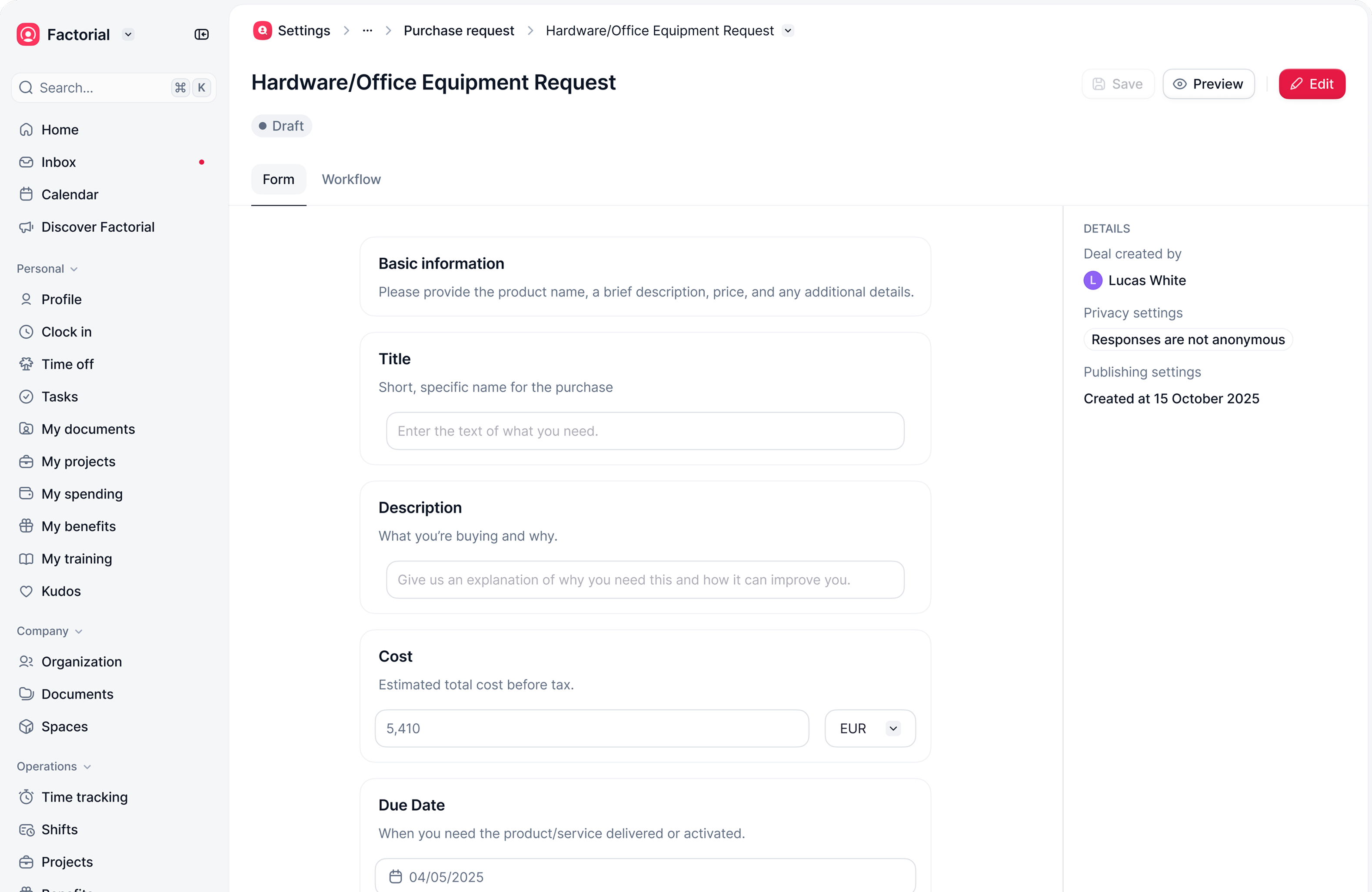 Trigger and first step as defaults: When creating a workflow, users start by selecting the purchase category. The first step is always configuring a form, a predefined template with mandatory data.