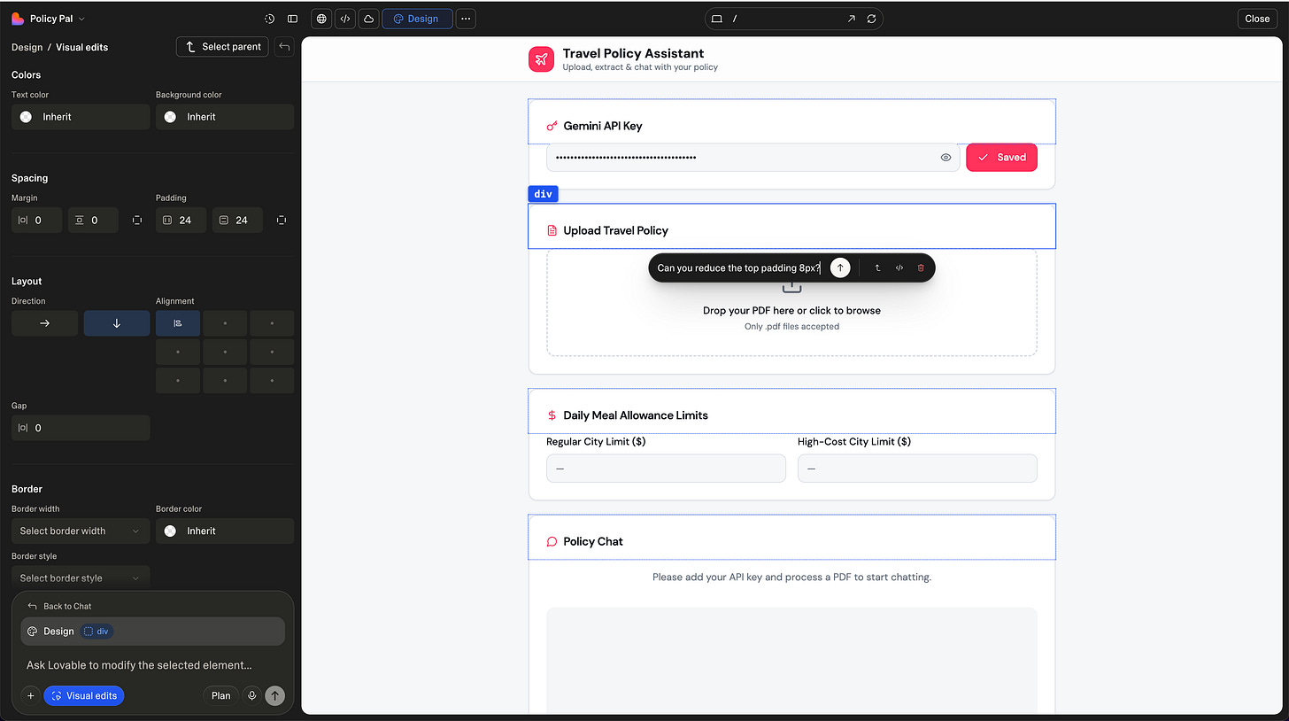 Lovable introduced something that changed how I think about this: not just a chat, but direct in-context editing of generated components.