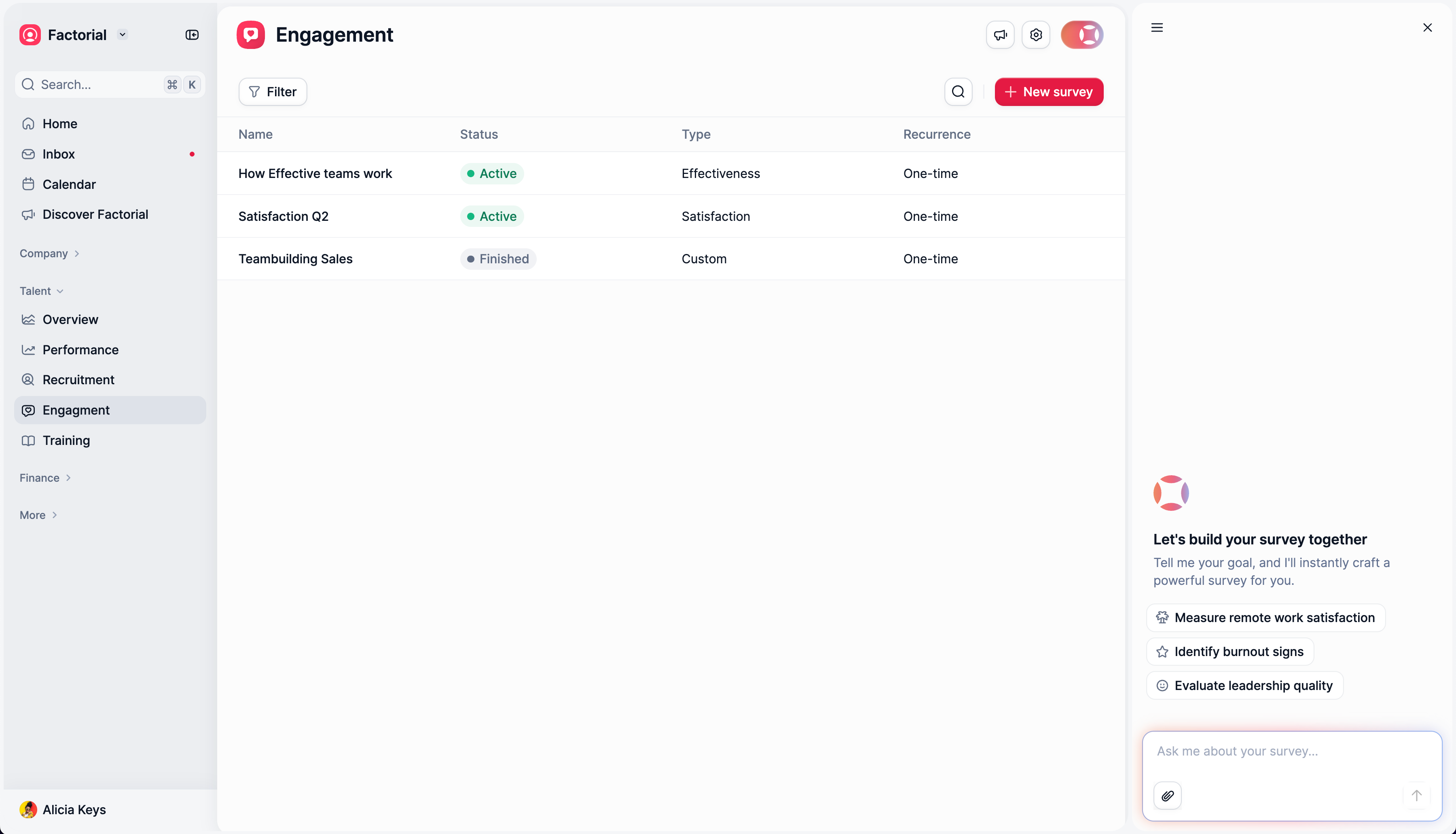 For example, at Factorial, when a user lands in the Engagement section, we don’t show generic AI options; we show suggestions directly relevant to engagement: survey templates, sentiment checks, and team pulse questions. The interface reads where you are and shapes what you might want to do there.