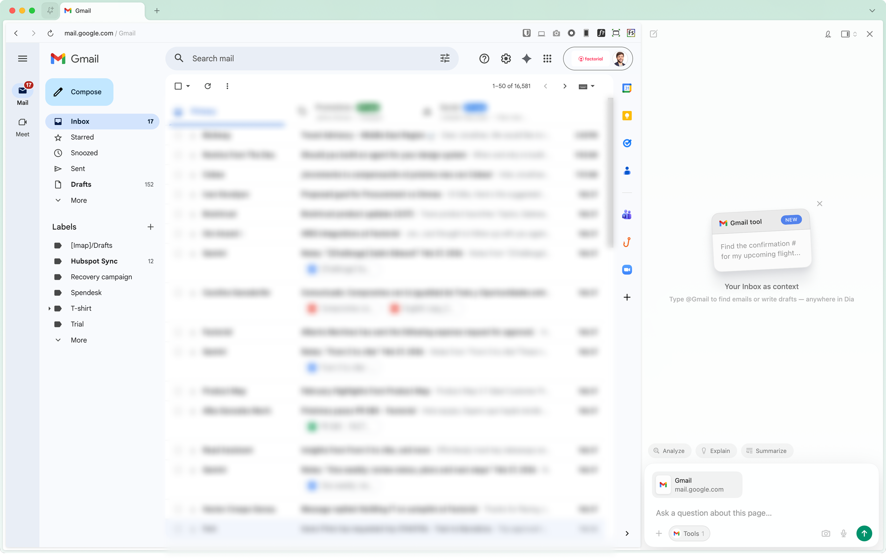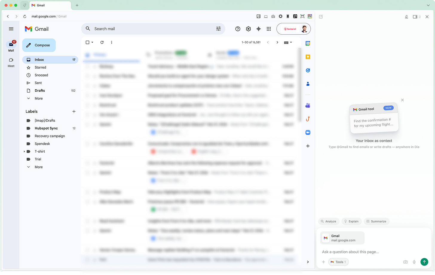 Dia does something similar: their entire empty state, the layout, the suggestions, and the interaction model adapt based on the active tab. Open Gmail, and it becomes an email assistant. The interface doesn’t wait for you to figure out what it can do. It tells you.